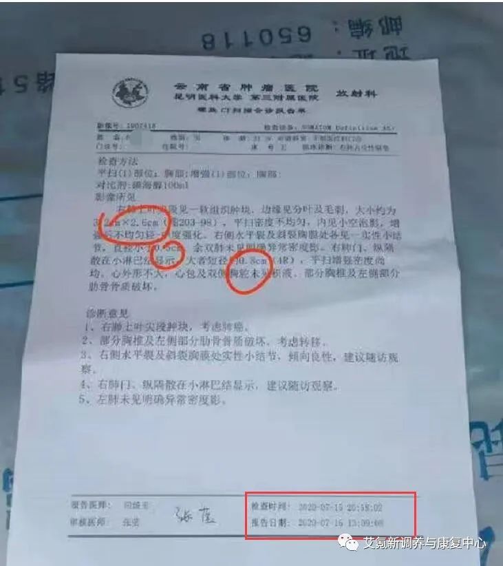这位患者小何来自云南文山,现年32岁,于2020年7月16日在云南肿瘤医院检查出肺癌并骨转移,右肺门、纵隔淋巴结转移最大约0.8cm。右肺叶上尖见一软组织肿块,大小约为3.2cmx2.6cm。右侧水平裂及斜裂胸膜处各见一实性小结节,直径小于0.5cm。